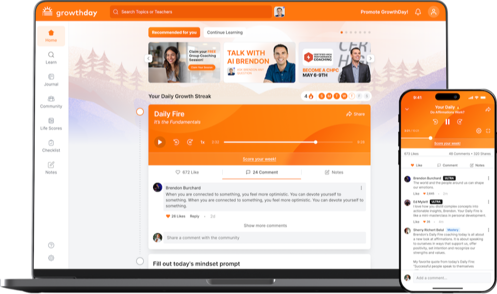 Brendon coaches you every day in GrowthDay. He helps keep you on your A-game and more focused, confident, resilient, and driven to win life! So join free now and try it out. If you stay, you'll KEEP getting Brendon's Daily Fire high-performance audio every single day for a year!